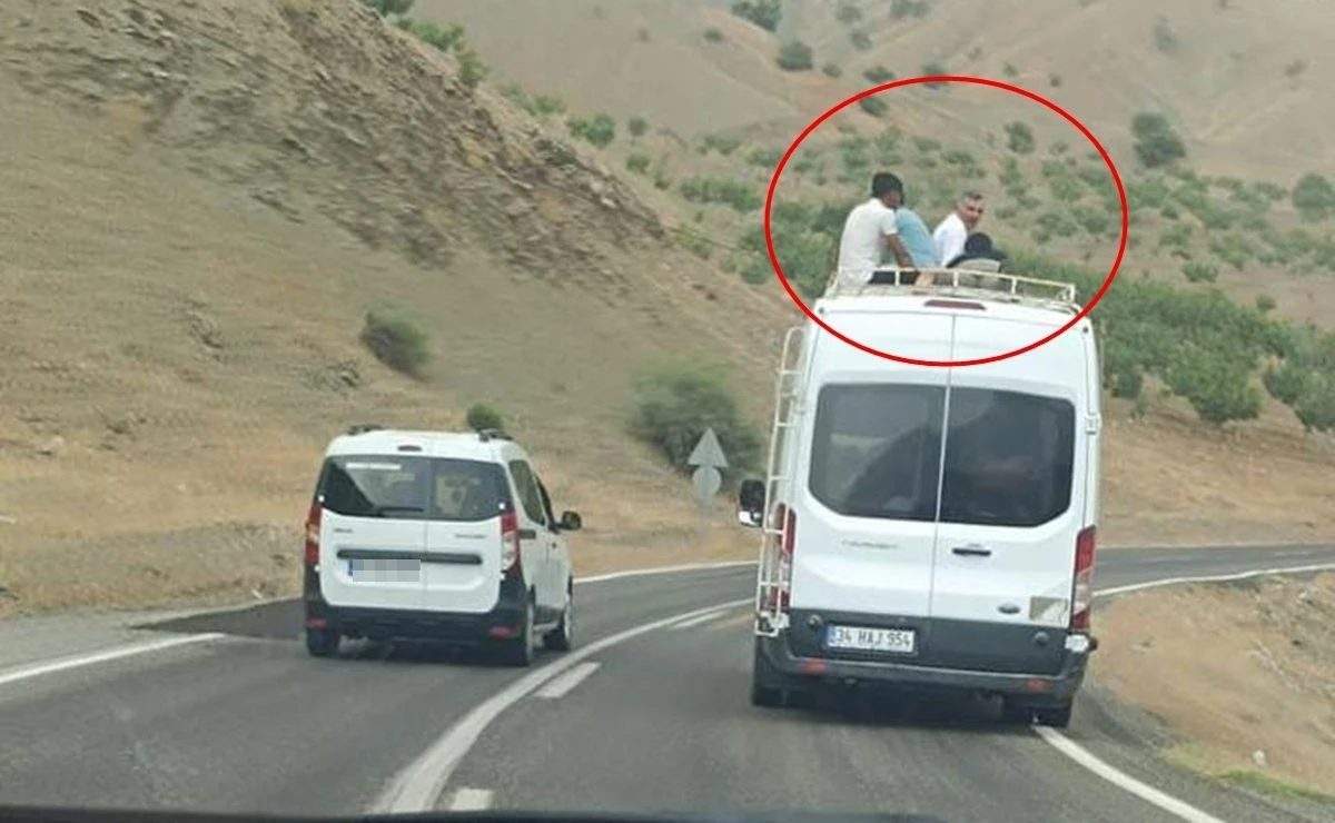 Siirt-Pervari kara yolunda, 4 kişi minibüsün üzerine çıkarak kilometrelerce tehlikeli bir yolculuk yaptı. Olay, cep telefonu kamerasıyla kaydedildi.