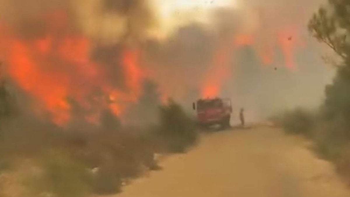 Antalya'da çıkan orman yangınında ekiplerin alevlerin içerisinde kalmaktan son anda kurtulduğu anlar cep telefonu ile görüntülendi.
