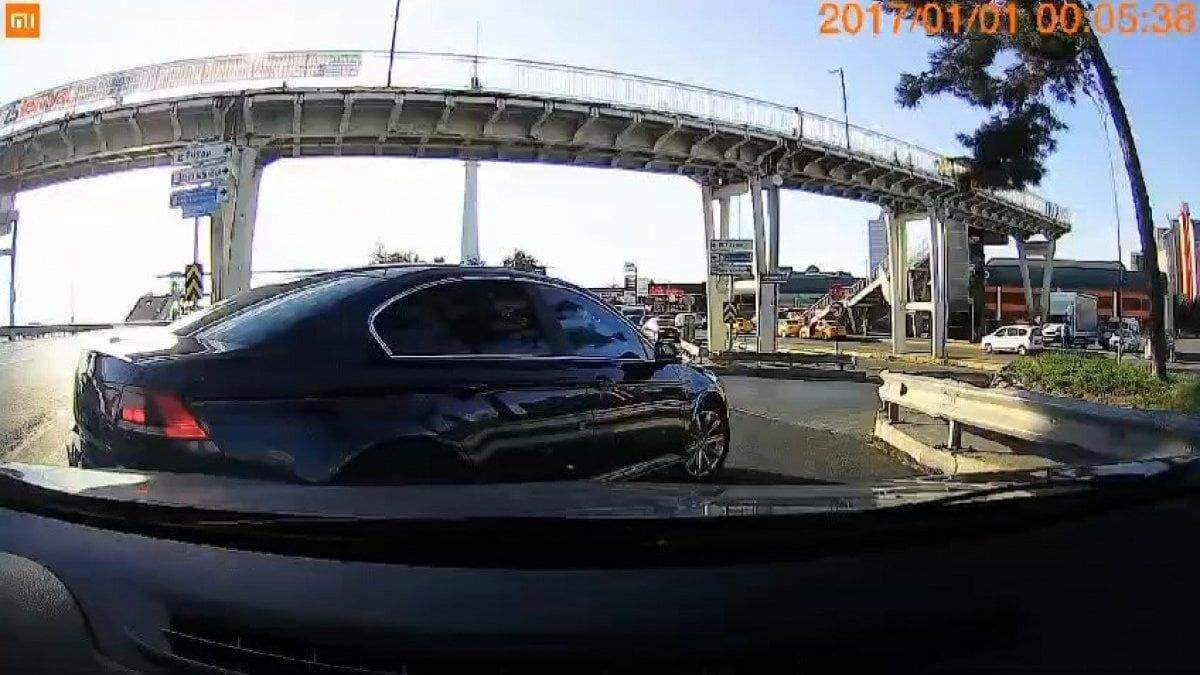 Büyükçekmece'de otomobil sürücüsü, sinyal vermeden yan yola girdiğini iddia ettiği aracın önünü kesince ortalık karıştı. Trafikteki kavga araç kamerasına yansıdı.