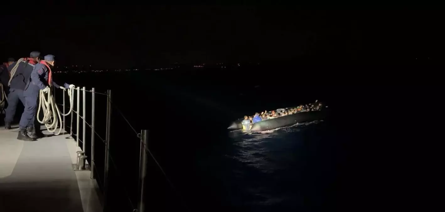 İZMİR'in Çeşme ilçesi açıklarında lastik botta bulunan 32'si çocuk 54 kaçak göçmen Sahil Güvenlik ekiplerince yakalandı; Karaburun ilçesi açıklarında ise 2…