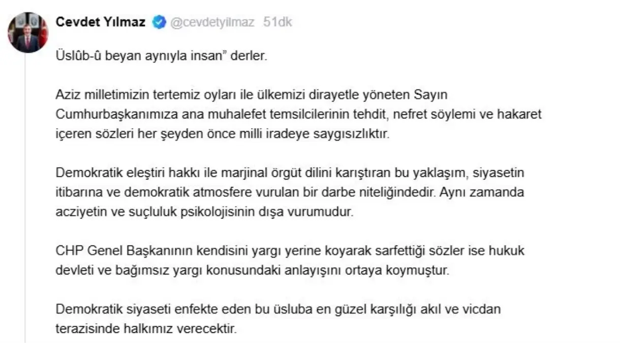 Cevdet Yılmaz’dan CHP Liderine Tepki: ‘Milli İradeye Saygısızlık’