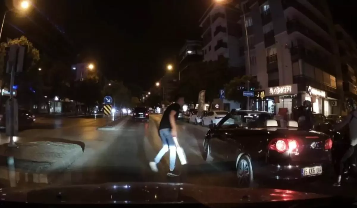 Karşıyaka'da bir otomobil sürücüsü trafikteki tartışma sonrası döner bıçak çekti. Olay kamerada.