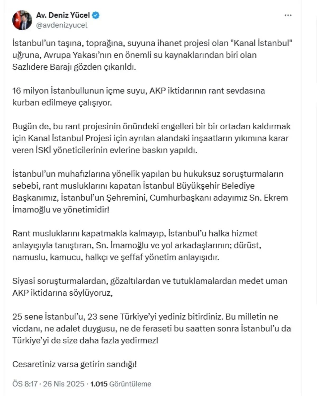 Deniz Yücel, Kanal İstanbul projesinin Sazlıdere Barajı'nı tehlikeye attığını vurguladı.