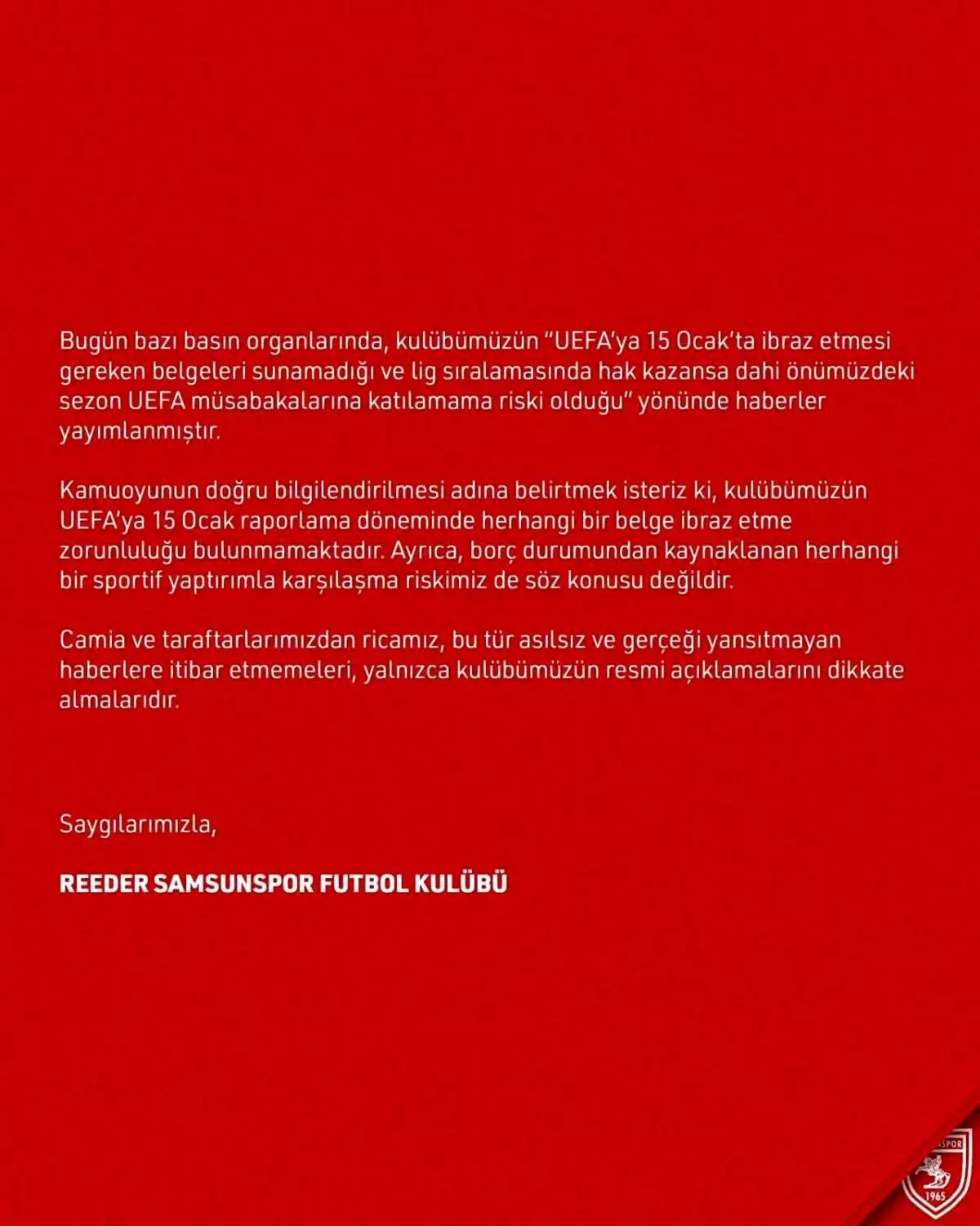 Samsunspor, UEFA'ya katılım riskinin asılsız olduğunu duyurdu.