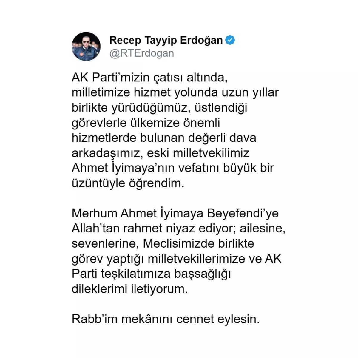 Cumhurbaşkanı Recep Tayyip Erdoğan ve siyasi isimler eski milletvekili Ahmet İyimaya'nın vefatı sonrası taziye mesajı yayımladı.