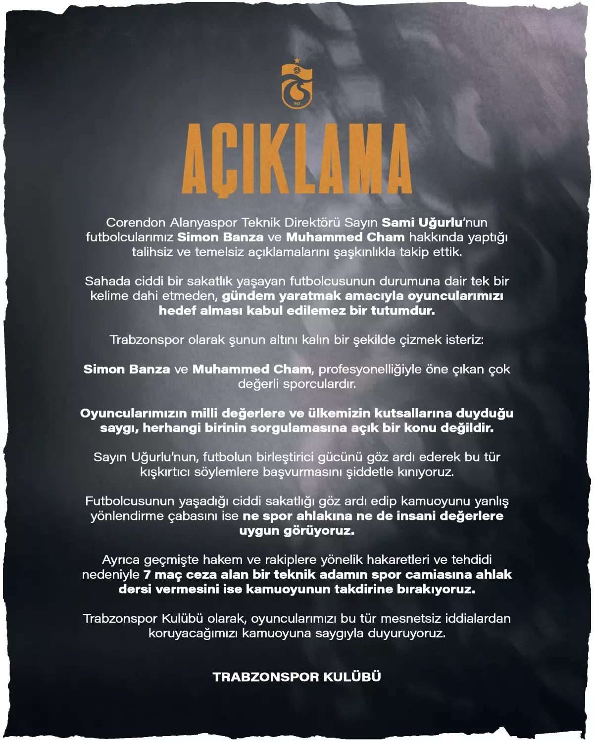 Trabzonspor, Alanyaspor'un teknik direktörü Sami UÄŸurlu'nun oyuncuları hakkında yaptığı açıklamaları talihsiz ve temelsiz bulduÄŸunu duyurdu. Kulüp, UÄŸurlu'nun tutumunu kınadı ve…