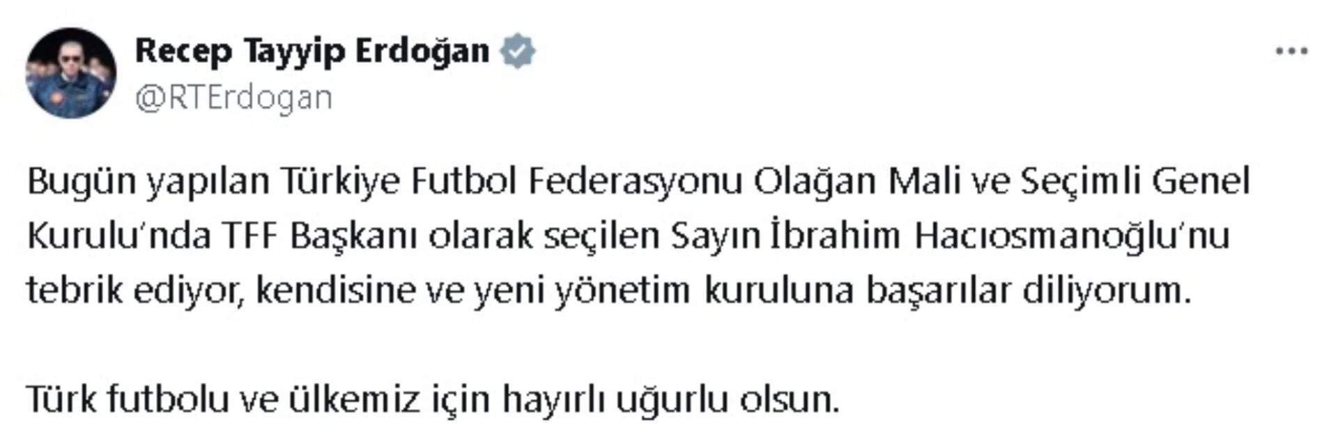 CumhurbaÅŸkanı Recep Tayyip ErdoÄŸan, TFF OlaÄŸan Mali ve Seçimli Genel Kurulu'nda BaÅŸkan seçilen İbrahim HacıosmanoÄŸlu'nu tebrik etti. ErdoÄŸan, sosyal medya…