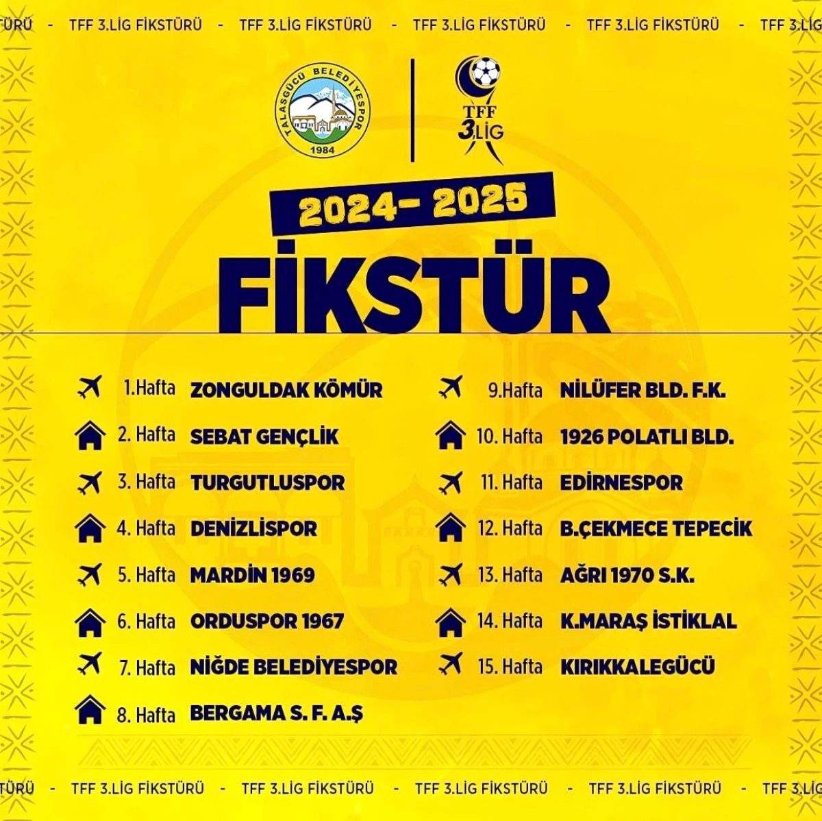 TFF 3. Lig 4. Grup ekiplerinden Talasgücü Belediyespor'un 2024-2025 sezonu fikstürü açıklandı. Sarı lacivertliler, Zonguldak Kömürspor deplasmanında başlayacak.