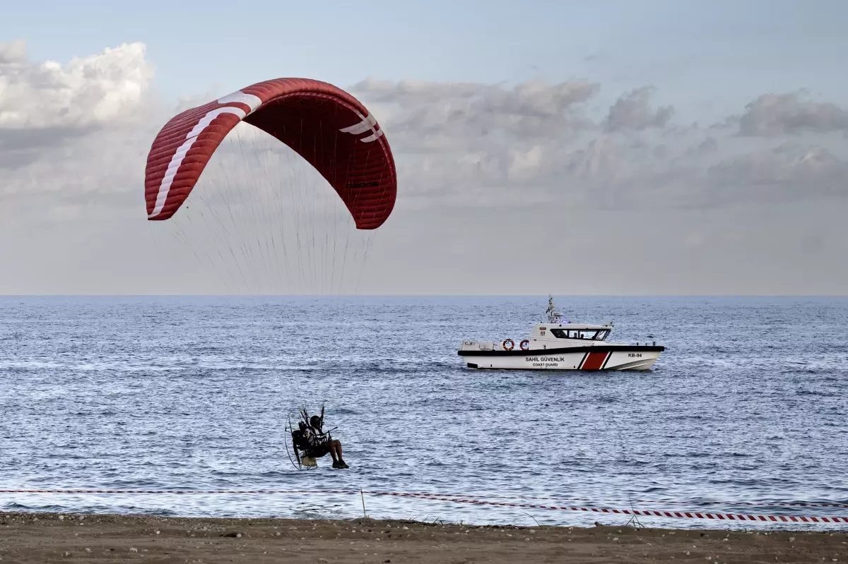 Kemer'de düzenlenen uçuş festivalinde yamaç paraşütçüleri 2365 metreden atladı, meme kanseri için afiş açıldı.