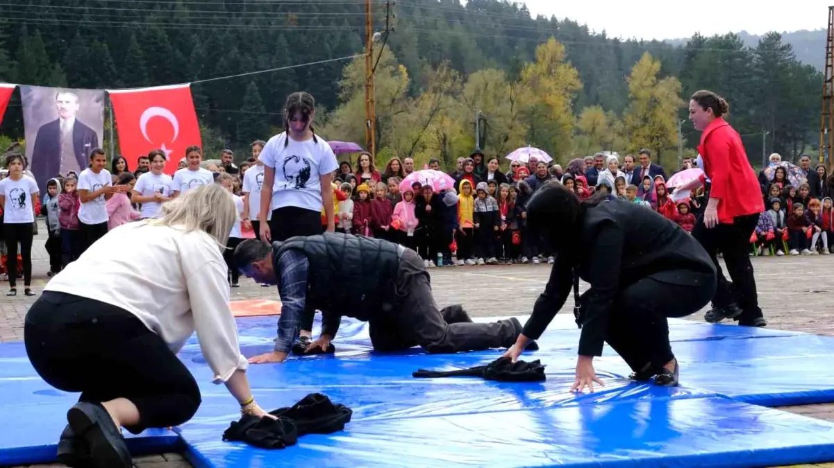 Yağmur altında düşen kızını kurtaran baba, minderleri düzeltip gösteriyi başarıyla devam ettirdi.