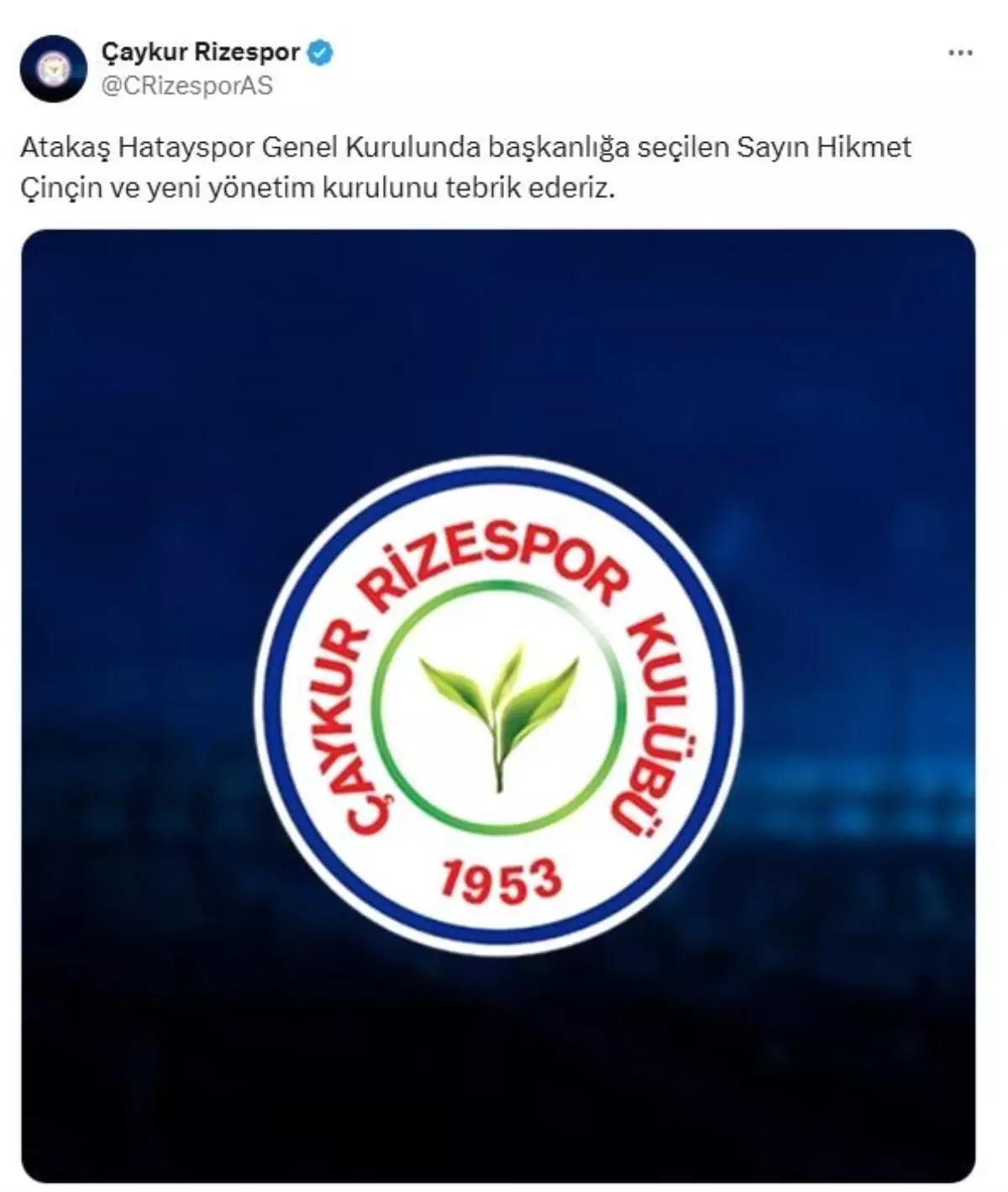 Çaykur Rizespor, Atakaş Hatayspor’un yeni başkanı Hikmet Çinçin için tebrik mesajı yayımladı.