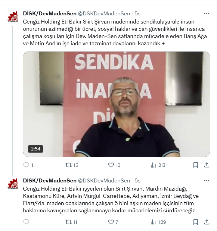 Dev-Maden-Sen, Barış Ağa ve Metin And adlı işçilerin bir an önce işe iadelerini talep etti. Dev-Maden-Sen Örgütlenme Uzmanı Sait Demir, bundan 8-9 ay önce Eti Bakır’ın toplam 7 parça iş yerinde örgütlenmeye başladıklarını söyledi. Siirt Şirvan’daki ...