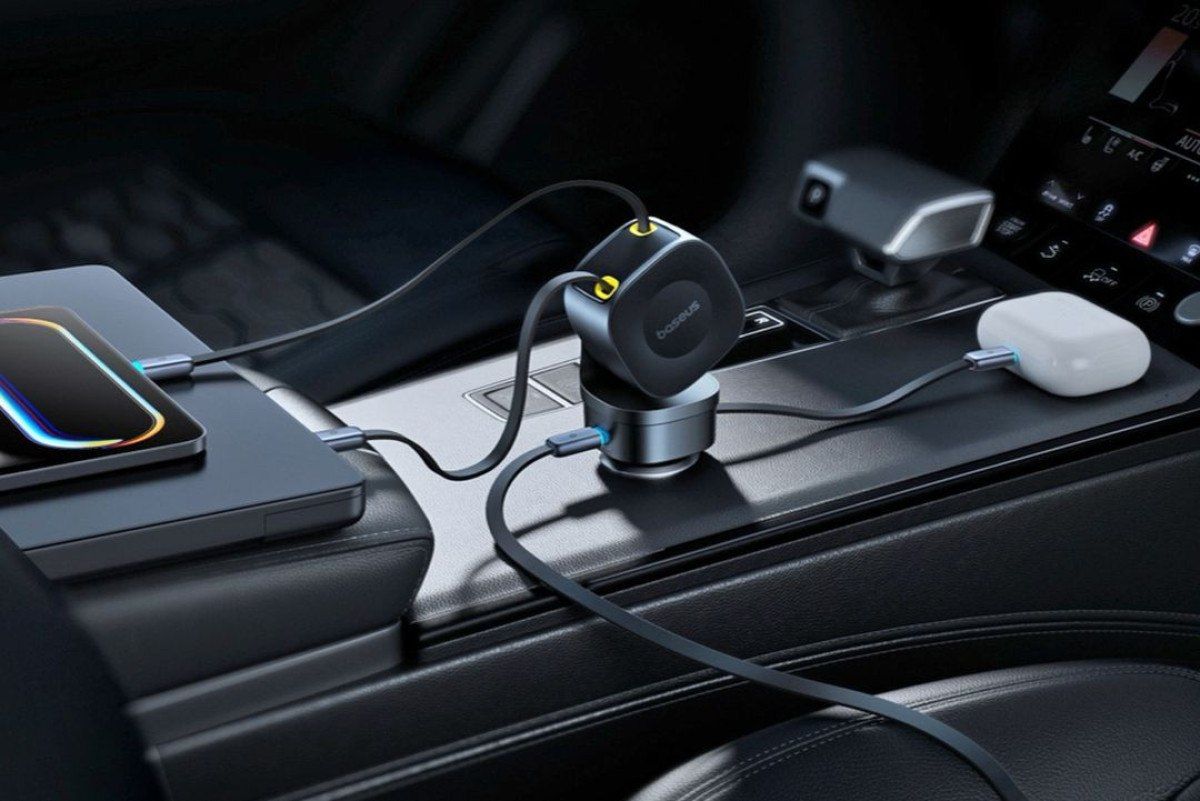 Baseus PrimeTrip VR2 Max, 240W toplam güç çıkışı ve geri çekilebilir USB-C kabloları ile aynı anda dört cihazı şarj edebilen bir araç şarj cihazı.