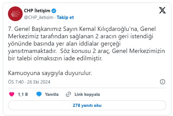 Kılıçdaroğlu’nun araçları kendi isteğiyle iade ettiği kaydedilen açıklamada, “7. Genel Başkanımız Sayın Kemal Kılıçdaroğlu’na, Genel Merkezimiz tarafından sağlanan 2 aracın geri istendiği yönünde basında yer alan iddialar gerçeği yansıtmamaktadır” ifadeleri kullanıldı. Açıklamada, “Söz konusu 2 araç, Genel Merkezimizin bir talebi olmaksızın iade edilmiştir” denildi.