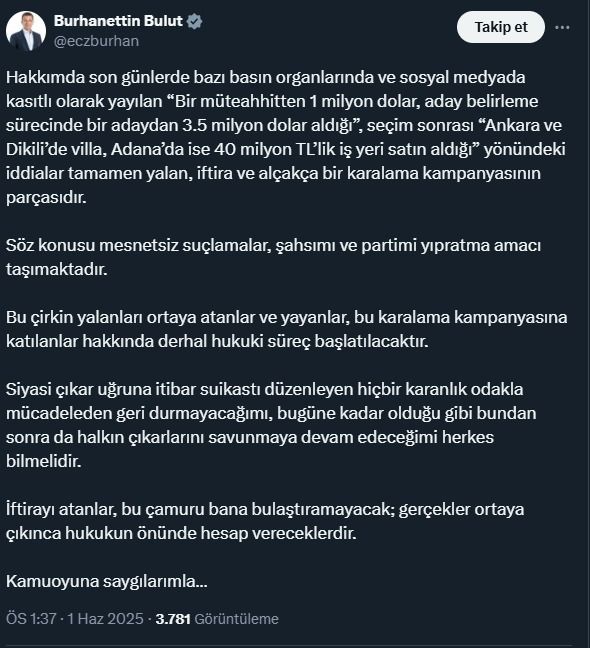 CHP Genel Başkan Yardımcısı Burhanettin Bulut, sosyal medya hesabından yaptığı açıklamada, hakkında son günlerde bazı basın organlarında ve sosyal medyada kasıtlı olarak yayılan, “Bir müteahhitten 1 milyon dolar, aday belirleme sürecinde bir adaydan 3.5 milyon dolar, seçim sonrası Ankara ve Dikili’de villa, Adana’da ise 40 milyon TL’lik iş yeri satın aldığı” yönündeki iddiaların, tamamen yalan, iftira ve alçakça bir karalama kampanyasının parçası olduğunu belirtti.