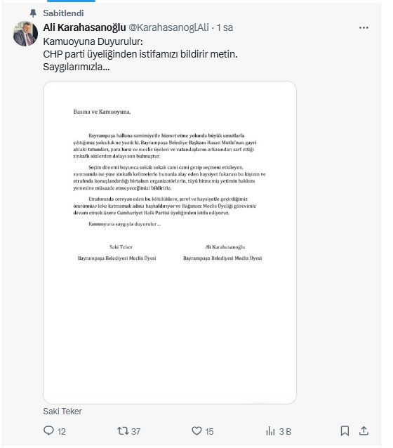 CHP Bayrampaşa Belediye Meclis üyeleri Saki Teker ve Ali Karahasanoğlu, partilerinden istifa etti. Yapılan açıklamada, "Bayrampaşa halkına samimiyetle hizmet etme yolunda büyük umutlarla çıktığımız yolculuk, Bayrampaşa Belediye Başkanı Hasan Mutlu'nun gayri ahlaki tutumları, para hırsı ve meclis üyeleri ve vatandaşların arkasından sarf ettiği sinkaflı sözlerden dolayı son bulmuştur" denildi.