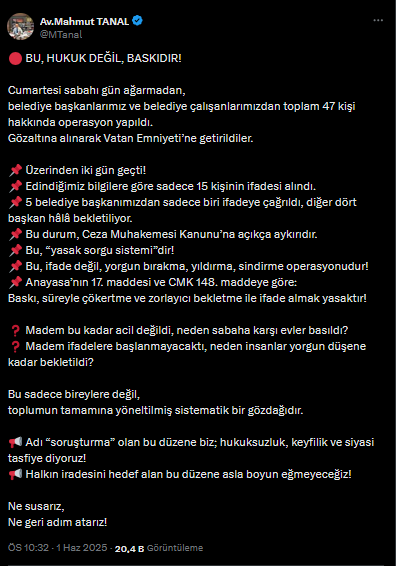 Tanal, Ceza Muhakemesi Kanunu ve Anayasa’nın açık hükümlerine aykırı şekilde insanların uzun süre gözaltında tutulduğunu belirterek, “Bu bir ifade alma süreci değil, yorgun düşürme, sindirme operasyonudur” dedi. “Eğer bu kadar acil bir durum yoksa neden sabaha karşı evler basıldı? Madem hemen ifade alınmayacaktı, neden insanlar günlerce bekletildi?” sorularını yönelten Tanal, yaşananları toplumun tamamına verilmiş bir gözdağı olarak değerlendirdi.