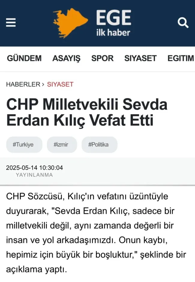 Afyon Merkezli yerel bir haber sitesinde CHP İzmir Milletvekili Sevda Erdan Kılıç’ın hayatını kaybettiğine yönelik haberler yayımlandı.