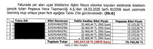 THY/Pegasus’un beyan ettiği gerçek bilet fiyatı toplamı: 5.891.000 TL