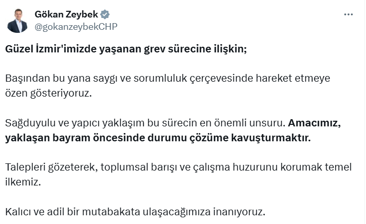 CHP Yerel Yönetimlerden Sorumlu Genel Başkan Yardımcısı Gökan Zeybek, İzmir’deki greve ilişkin sosyal medya hesabından bir paylaşım yaptı.
