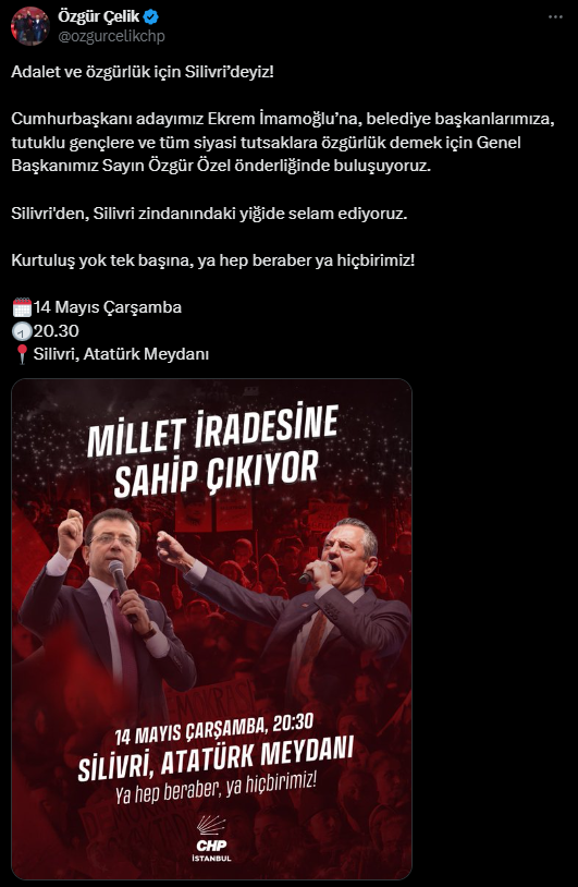 CHP İstanbul İl Başkanı Özgür Çelik, sosyal medya hesabından yaparak Silivri’de düzenlenecek olan mitingi şu ifadelerle duyurdu: