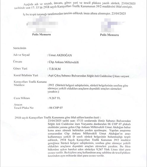 23 Nisan’da partisinin otobüsünü kullanan CHP Ankara Milletvekili Umut Akdoğan’a, sahip olduğu sürücü belgesinin sınıfı dışındaki aracı kullandığı gerekçesiyle 9 bin 267 TL idari para cezası verildi. Akdoğan, sosyal medya hesabından konuya ilişkin yaptığı açıklamada, kendisine para cezası verildiğini duyururken tutanaktaki yazım yanlışlarına da dikkat çekti.