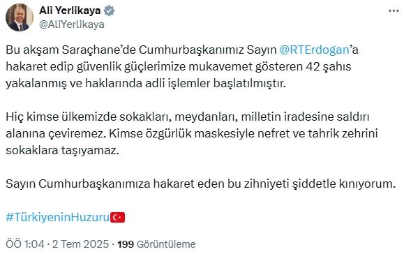 Yerlikaya, sosyal medya hesabından yaptığı açıklamada şu ifadelere yer verdi: “Bu akşam Saraçhane’de Cumhurbaşkanımız Sayın Recep Tayyip Erdoğan’a hakaret edip güvenlik güçlerimize mukavemet gösteren 42 şahıs yakalanmış ve haklarında adli işlemler başlatılmıştır.