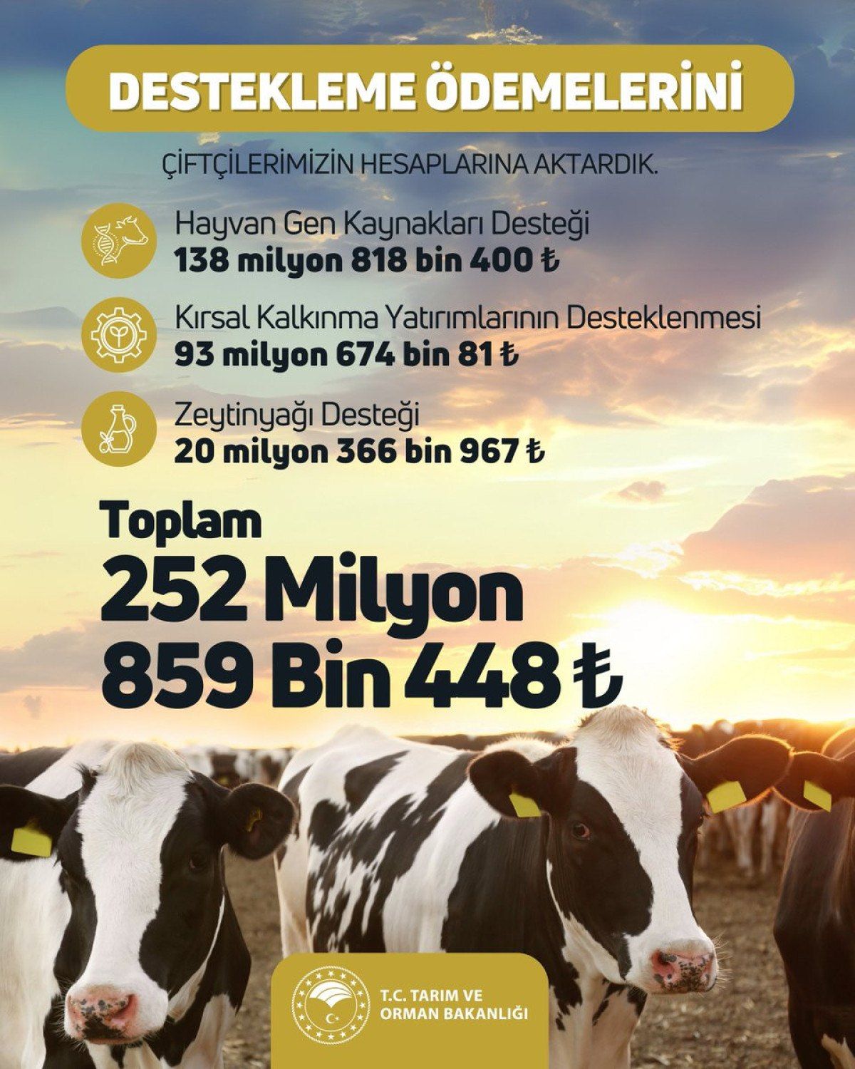 Hayvan gen kaynakları desteği 138 milyon 818 bin 400 lira, kırsal kalkınma yatırımlarının desteklenmesi 93 milyon 674 bin 81 lira, zeytinyağı desteği 20 milyon 366 bin 967 lira olmak üzere toplam 252 milyon 859 bin 448 lira tarımsal destekleme ödemesini çiftçilerimizin hesaplarına aktardık.