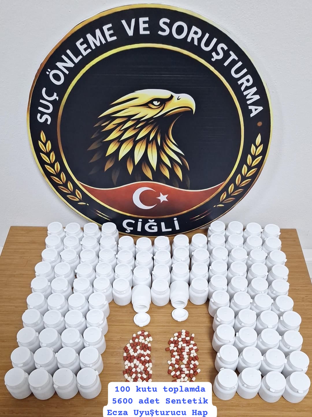 Çiğli İlçe Emniyet Müdürlüğü ekiplerince Uyuşturucu Madde Ticaretine ve İmalatına yönelik yapılan çalışmalar kapsamında idaremiz Evka-5 Mahallesinde yapılan operasyon çerçevesinde (M.S) isimli şüpheli şahıs yakalanmış, şüphelinin üzerinden ve ikametinde yapılan aramada; 100 kutu içerisinde 5.600 adet sentetik uyuşturucu hap ele geçirilmiş, şahıs adli mercilere sevk edilmiştir.