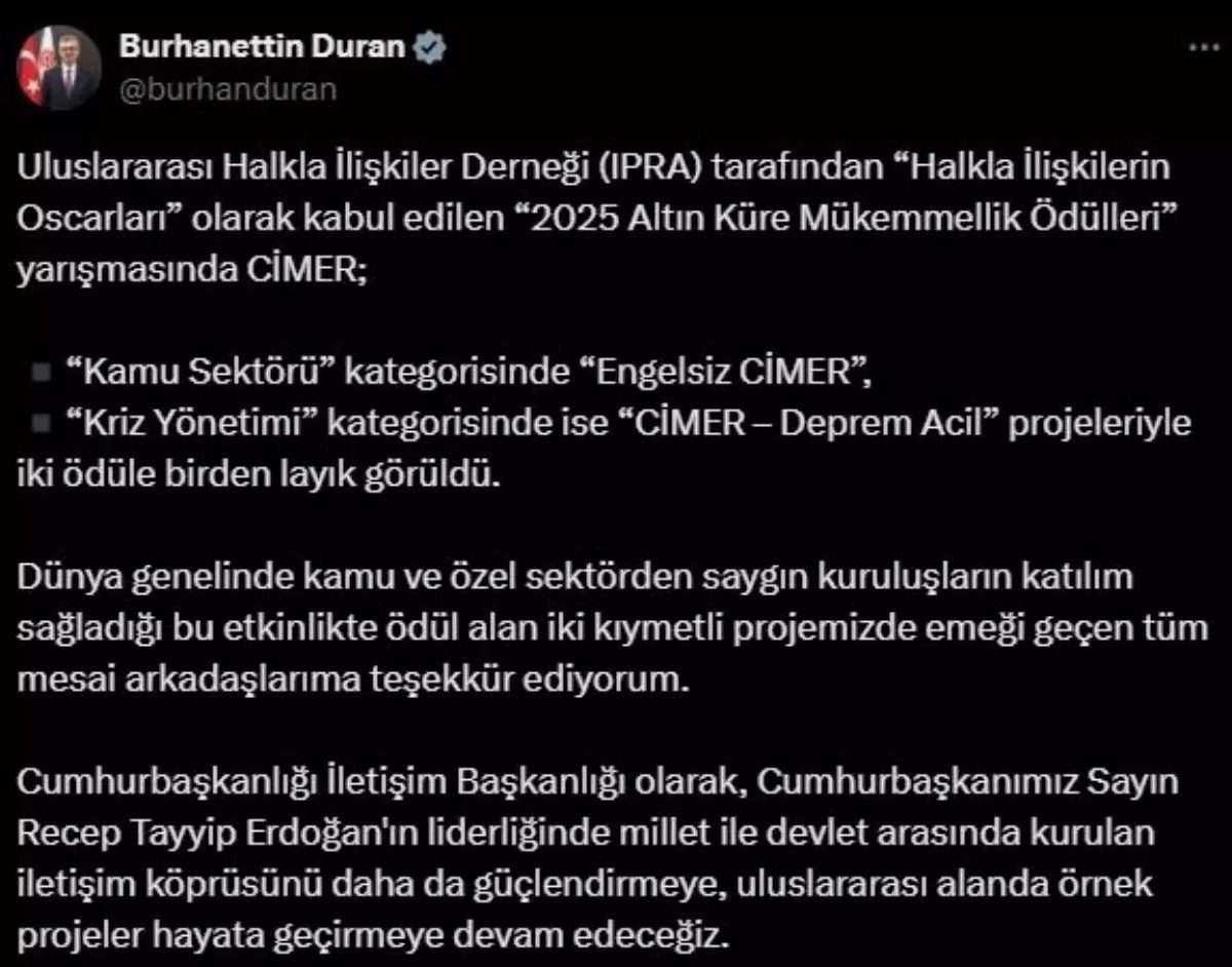 İletişim Başkanı Burhanettin Duran, sosyal medya hesabından yaptığı paylaşımda, “Uluslararası Halkla İlişkiler Derneği (IPRA) tarafından ‘Halkla İlişkilerin Oscarları’ olarak kabul edilen ‘2025 Altın Küre Mükemmellik Ödülleri Yarışması’nda CİMER; ‘Kamu Sektörü’ kategorisinde ‘Engelsiz CİMER’, ‘Kriz Yönetimi’ kategorisinde ise ‘CİMER- Deprem Acil’ projeleriyle iki ödüle birden layık görüldü. Dünya genelinde kamu ve özel sektörden saygın kuruluşların katılım sağladığı bu etkinlikte ödül alan iki kıymetli projemizde emeği geçen tüm mesai arkadaşlarıma teşekkür ediyorum. Cumhurbaşkanlığı İletişim Başkanlığı olarak, Cumhurbaşkanımız Sayın Recep Tayyip Erdoğan’ın liderliğinde millet ile devlet arasında kurulan iletişim köprüsünü daha da güçlendirmeye, uluslararası alanda örnek projeler hayata geçirmeye devam edeceğiz” ifadelerini kullandı.