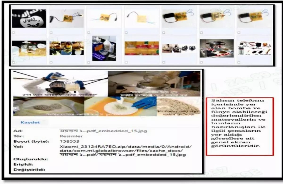 bilgilere ulaşılan Türkmenistan kökenli D.R.’yi geçtiğimiz Temmuz ayında yakın takibe aldı. D.R.’nin örgüt kontrolünde hareket ettiği anlaşınca Çocuk Şube Müdürlüğü ile yürütülen koordineli çalışmayla operasyon kararı alındı. O tarihte yapılan operasyonda D.R. gözaltına alındı. Zanlıdan ele geçirilen dijital incelemelerde, örgüt içi kapalı devre haberleşme programları ve uygulamaları (RocketChat, Techhaven, Trueerypt, Vepaerypt) ile çeşitli şifreleme programlarının izine ulaşıldı. Bu dijitallerde, Dron kullanımı hakkında çeşitli dokümanlar ve görseller, söz konusu görsellerde patlayıcı madde yapımına dair dokümanlar ve eğitim videoları, evde patlayıcı bomba yapımına dair videolar yer aldı. Ayrıca aynı materyallerde, araçlara saldırı/eylem yapılabilmesi için kılavuz ve görsellerin bulunduğu örgütsel dokümanlarda, “saldırı taktikleri” isimli klasör ve çok sayıda örgütsel doküman deşifre edildi.