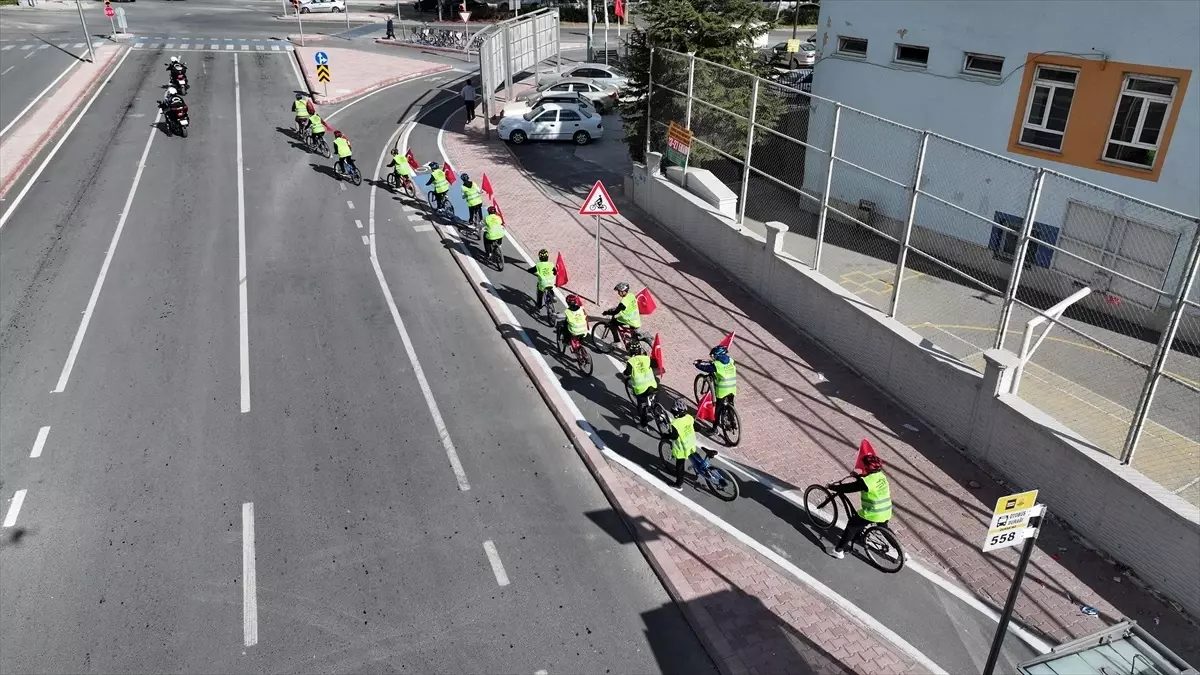 Konya Büyükşehir Belediyesi zabıta birimlerinin ve öğretmenlerin eşlik ettiği sürüş esnasında öğrenciler, bisikletlerinin gidonlarına bağladıkları bayraklarla belirlenen güzergah boyunca pedal çevirdi.