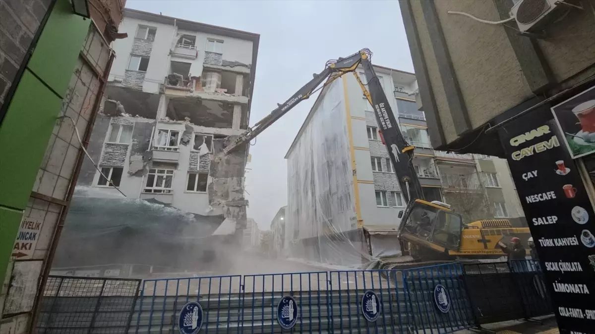 Polis ekiplerince yapılan uyarı anonsunun ardından iş makineleriyle hasarlı binanın yıkımına başlandı.