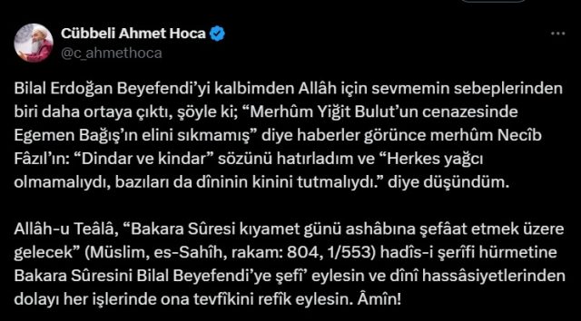 Kamuoyunda “Cübbeli Ahmet Hoca” olarak bilinen Ahmet Mahmut Ünlü, olayla ilgili sosyal medya hesabından dikkat çeken bir paylaşımda bulundu. Ünlü, Bilal Erdoğan’ın bu tavrını övgüyle değerlendirerek şu ifadeleri kullandı: