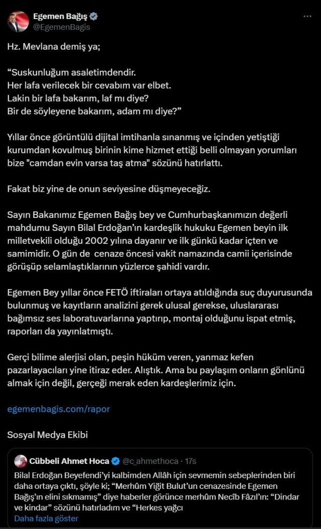 “Hz. Mevlana’nın dediği gibi: ‘Bir lafa bakarım laf mı diye, bir de söyleyene bakarım adam mı diye.’ Yıllar önce görüntülü dijital iftiralarla sınanmış ve yetiştiği kurumdan kovulmuş birinin kime hizmet ettiği belli olmayan yorumları, bize ‘camdan evin varsa taş atma’ sözünü hatırlattı. Biz yine de onun seviyesine inmeyeceğiz.”
