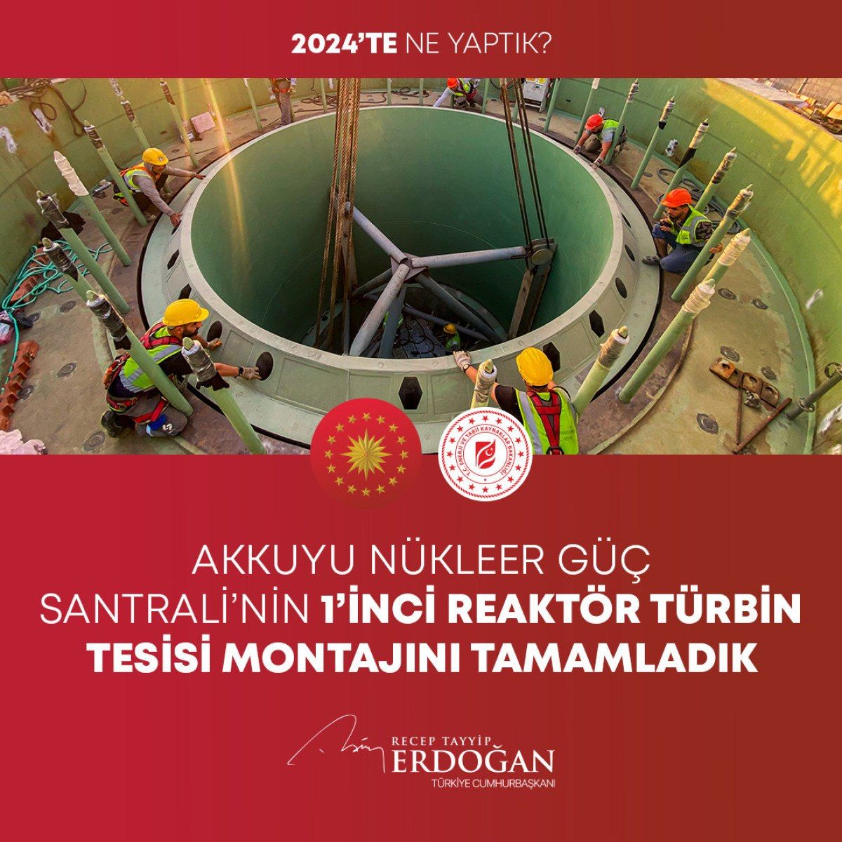 – Akkuyu Nükleer Güç Santralimizin 1’inci reaktör türbin tesisi montajını tamamladık. Türkiye’yi dünyanın nükleer güç sahibi ülkeleri arasına sokmakta kararlıyız.