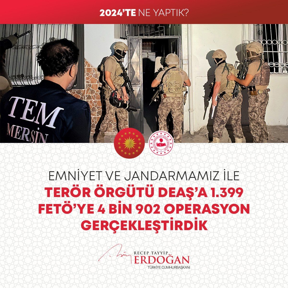 Cumhurbaşkanı Recep Tayyip Erdoğan, sosyal medya hesabından “2024teNeYaptık” hashtag’i ile 2024 senesinde yapılanları paylaştı.