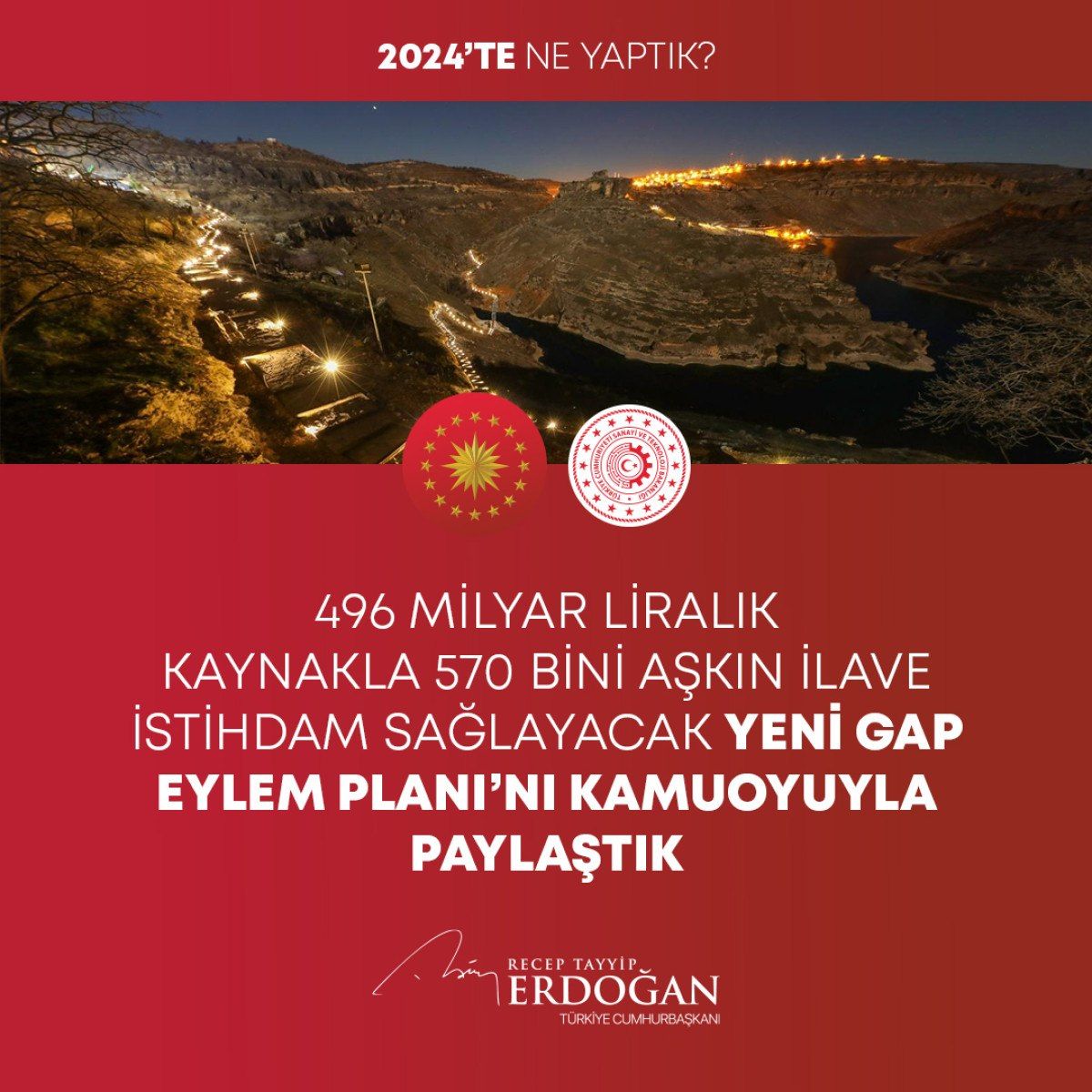– 496 milyar liralık kaynakla 570 bini aşkın ilave istihdamın önünü açacak olan Yeni GAP Eylem Planımızı kamuoyuyla paylaştık.