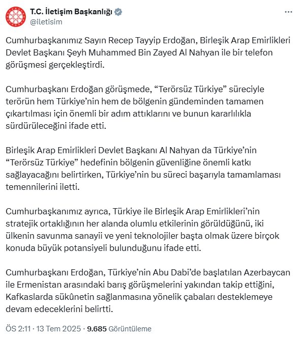 Cumhurbaşkanı Recep Tayyip Erdoğan, Birleşik Arap Emirlikleri (BAE) Devlet Başkanı Al Nahyan ile bir telefon görüşmesi gerçekleştirdi.