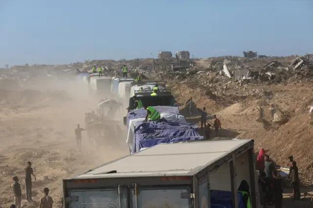Filistinli tüccarlara ait gıda ve meyve yüklü tırlar, Netzarim Koridoru’nun güneyinde bulunan Salahaddin caddesi üzerinden Gazze Şeridi’ne giriş yaptı.