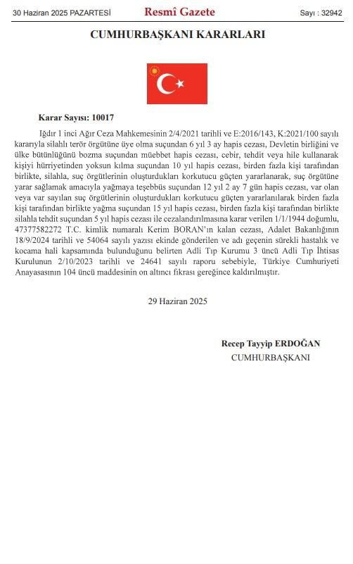 Affedilen isimlerden biri 1944 doğumlu Kerim Boran oldu. Silahlı terör örgütüne üye olma dahil birçok suçtan cezası bulunan 81 yaşındaki Boran, Adli Tıp Kurumu 3. İhtisas Kurulu’nun “sürekli hastalık ve kocama hali” raporuna dayanarak affedildi.