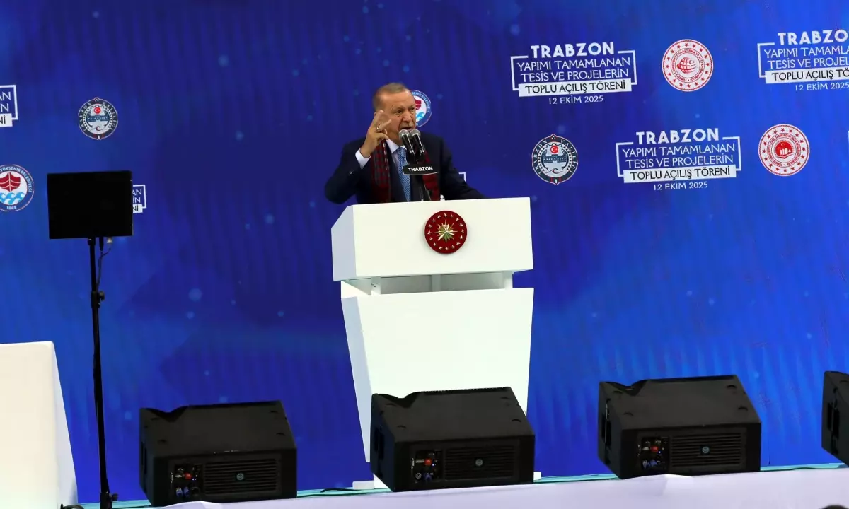 Cumhurbaşkanı Recep Tayyip Erdoğan, Trabzon’da yapımı tamamlanan tesis ve projelerin toplu açılış törenine katıldı. Hayri Gür Spor Salonu’ndaki törene Çevre, Şehircilik ve İklim Değişikliği Bakanı Murat Kurum, Gençlik ve Spor Bakanı Osman Aşkın Bak, İçişleri Bakanı Ali Yerlikaya, Sağlık Bakanı Kemal Memişoğlu, Tarım ve Orman Bakanı İbrahim Yumaklı, Ulaştırma ve Altyapı Bakanı Abdulkadir Uraloğlu, Kültür ve Turizm Bakanı Mehmet Nuri Ersoy, belediye başkanları, partililer ile çok sayıda kişi katıldı. Salonda ‘Kadın üretiyor reis destekliyor’, ‘Sevmeye bir ömrün yetmeyeceği özü bir, sözü bir, gönlü bir Recep Tayyip Erdoğan’, ‘Davasına sadık liderine aşık Trabzon’, ‘Kimsesizlerin kimsesi, mazlumların gür sesi’, ‘Sana olan sevgimiz anne-baba, vatan sevgisi gibidir değişmez reis’, ‘Bir bordoya bir maviye bir de sana hastayız reis’, ‘Eser ve hizmet siyaseti ile geleceğe yürüyoruz’, ‘Mazlumların hamisi dünya lideri’, ‘Gazze, Gazzeli kardeşlerimizindir, ebediyen de öyle kalacaktır’, ‘Dünyanın sustuğu yerde Türkiye konuştu’ şeklinde pankartlar asılması dikkat çekti.