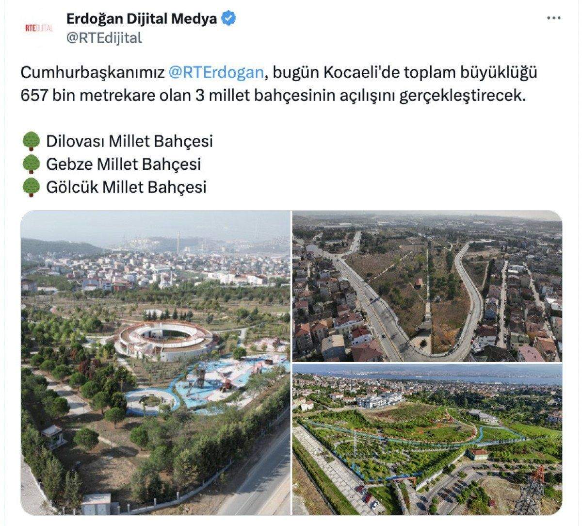 Sosyal medya platformundaki “Erdoğan Dijital Medya” hesabından yapılan paylaşımda, “Cumhurbaşkanımız Erdoğan, bugün Kocaeli’de toplam büyüklüğü 657 bin metrekare olan 3 millet bahçesinin açılışını gerçekleştirecek.” ifadelerine yer verildi.