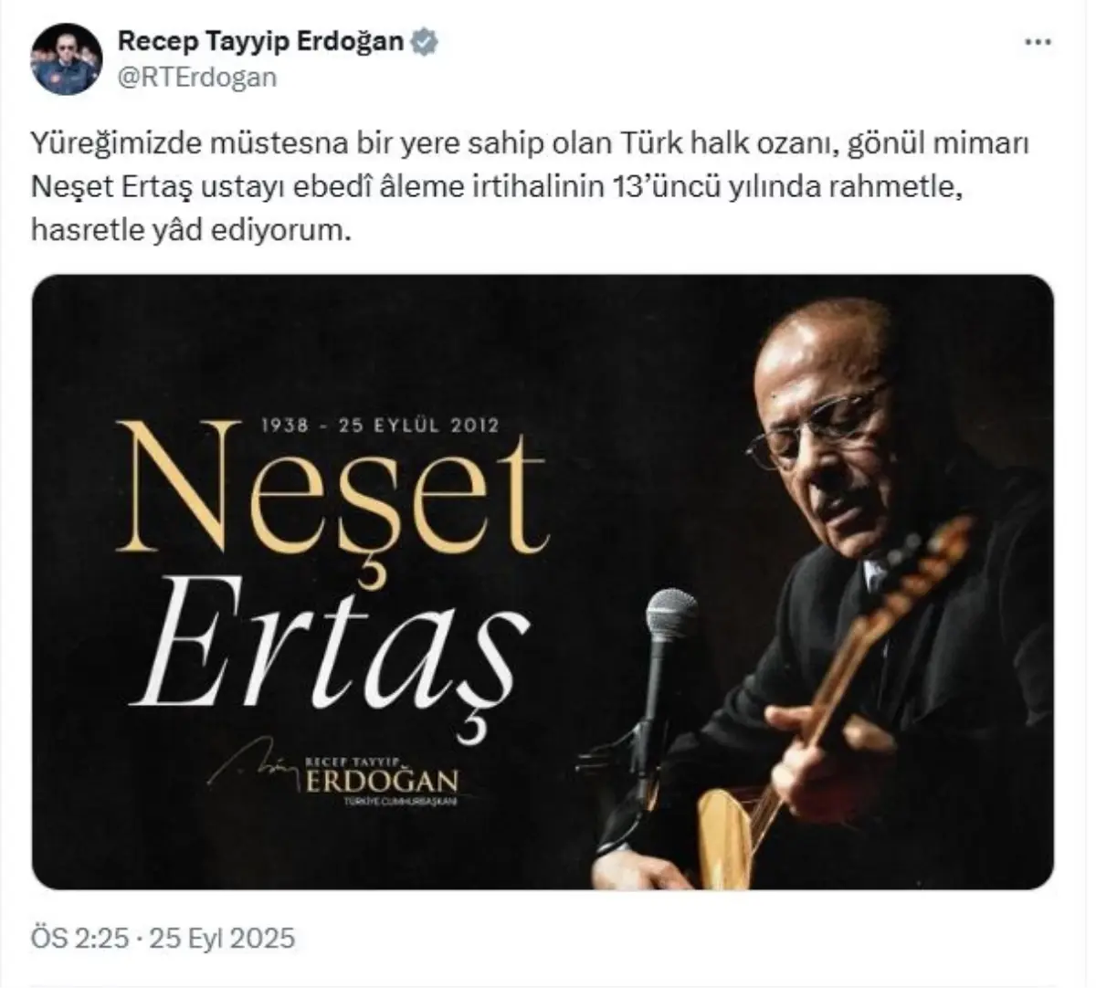 HABERLER Politika Cumhurbaşkanı Erdoğan: Neşet Ertaş ustayı rahmetle yad ediyorum