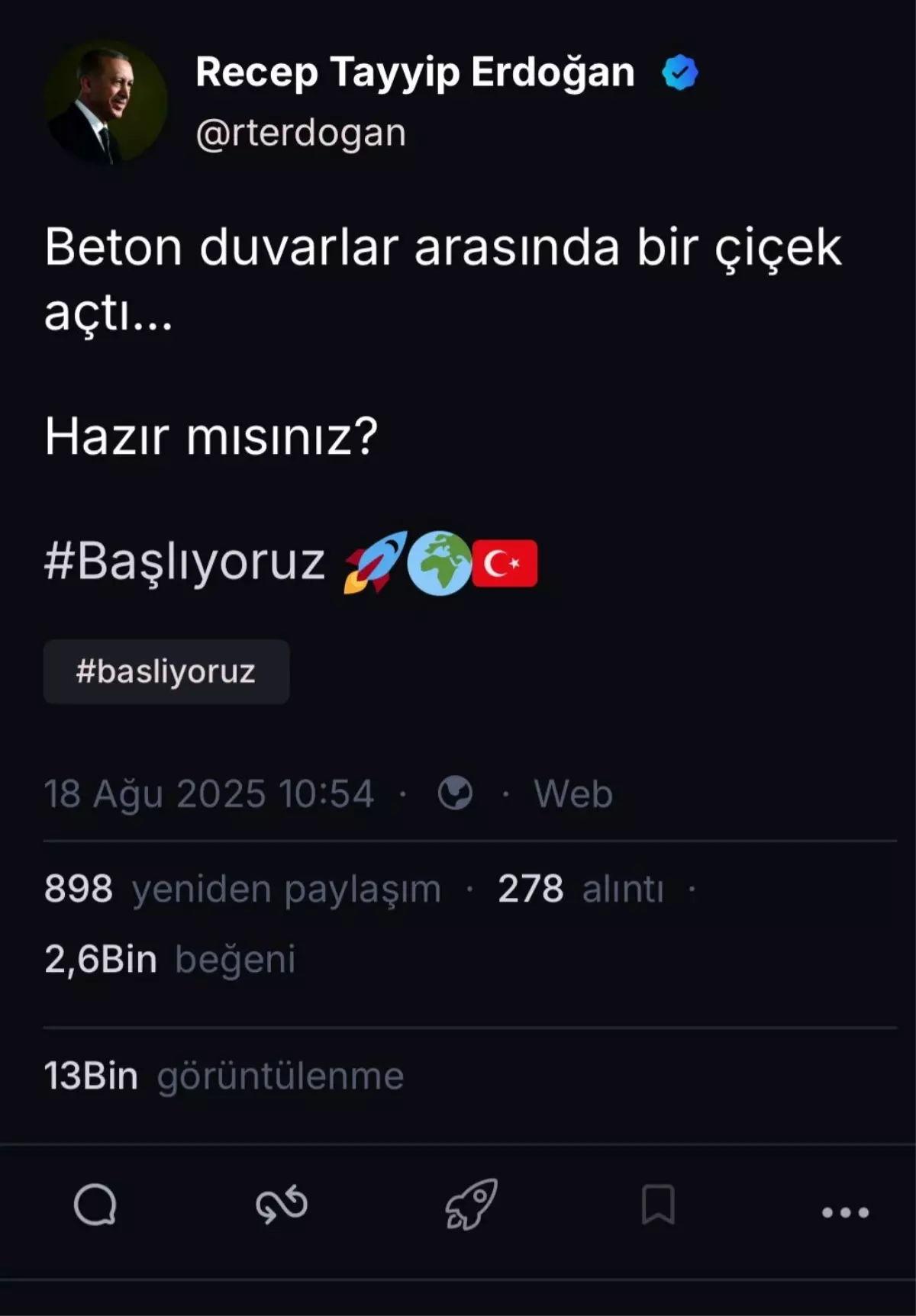 Cumhurbaşkanı Erdoğan, yerli sosyal medya platformu Next Sosyal’deki ilk paylaşımında, Erdem Bayazıt’ın ‘Birazdan Gün Doğacak’ şiirinden ‘Beton duvarlar arasında bir çiçek açtı’ mısrasına ve ‘Hazır mısınız?’ ifadelerine yer verdi. Erdoğan’ın ‘Başlıyoruz’ etiketli paylaşımında, Türk bayrağı, dünya ve roket emojileri yer aldı.