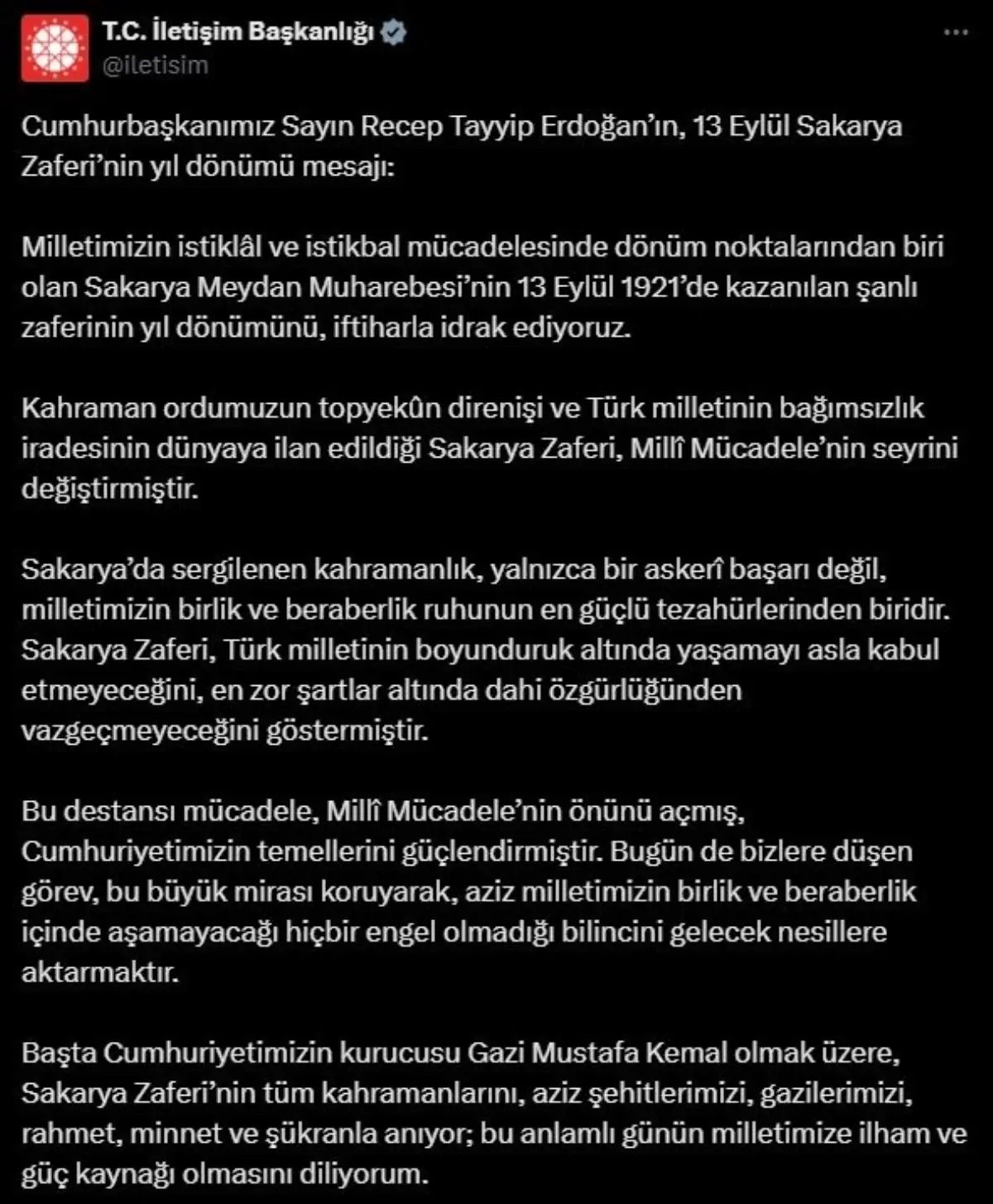 CUMHURBAŞKANI Recep Tayyip Erdoğan, 13 Eylül Sakarya Zaferi’nin yıl dönümü dolayısıyla mesaj yayımladı.
