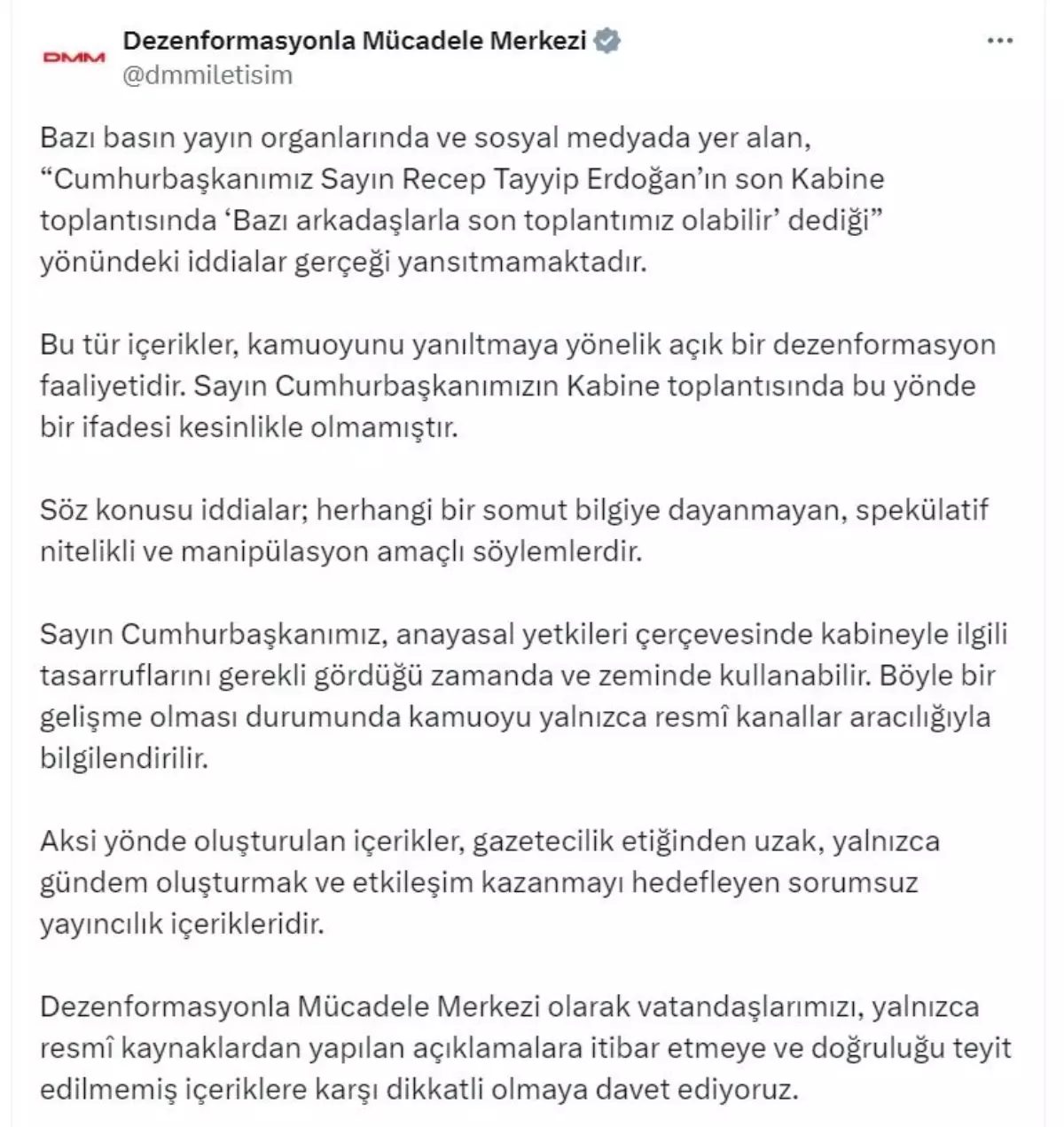 DMM’nin sosyal medya hesabından yapılan açıklamada, “Bazı basın yayın organlarında ve sosyal medyada yer alan, Cumhurbaşkanımız Sayın Recep Tayyip Erdoğan’ın son Kabine toplantısında ‘Bazı arkadaşlarla son toplantımız olabilir’ dediği yönündeki iddialar gerçeği yansıtmamaktadır. Bu tür içerikler, kamuoyunu yanıltmaya yönelik açık bir dezenformasyon faaliyetidir. Sayın Cumhurbaşkanımızın Kabine toplantısında bu yönde bir ifadesi kesinlikle olmamıştır. Söz konusu iddialar; herhangi bir somut bilgiye dayanmayan, spekülatif nitelikli ve manipülasyon amaçlı söylemlerdir” denildi.