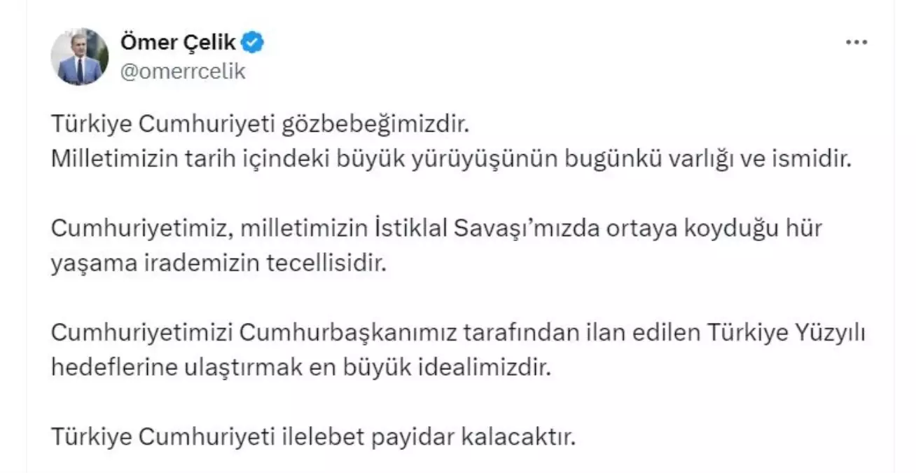 AK Parti Genel Başkan Yardımcısı ve Parti Sözcüsü Ömer Çelik, “Cumhuriyetimizi Cumhurbaşkanımız tarafından ilan edilen Türkiye Yüzyılı hedeflerine ulaştırmak en büyük idealimizdir. Türkiye Cumhuriyeti ilelebet payidar kalacaktır” dedi.
