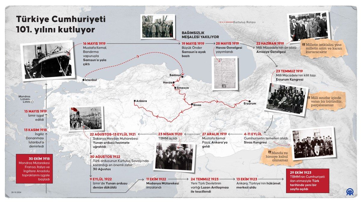Türkiye Cumhuriyeti, 2024 yılı itibarıyla 101. yaşını coşkuyla, inançla kutluyor.