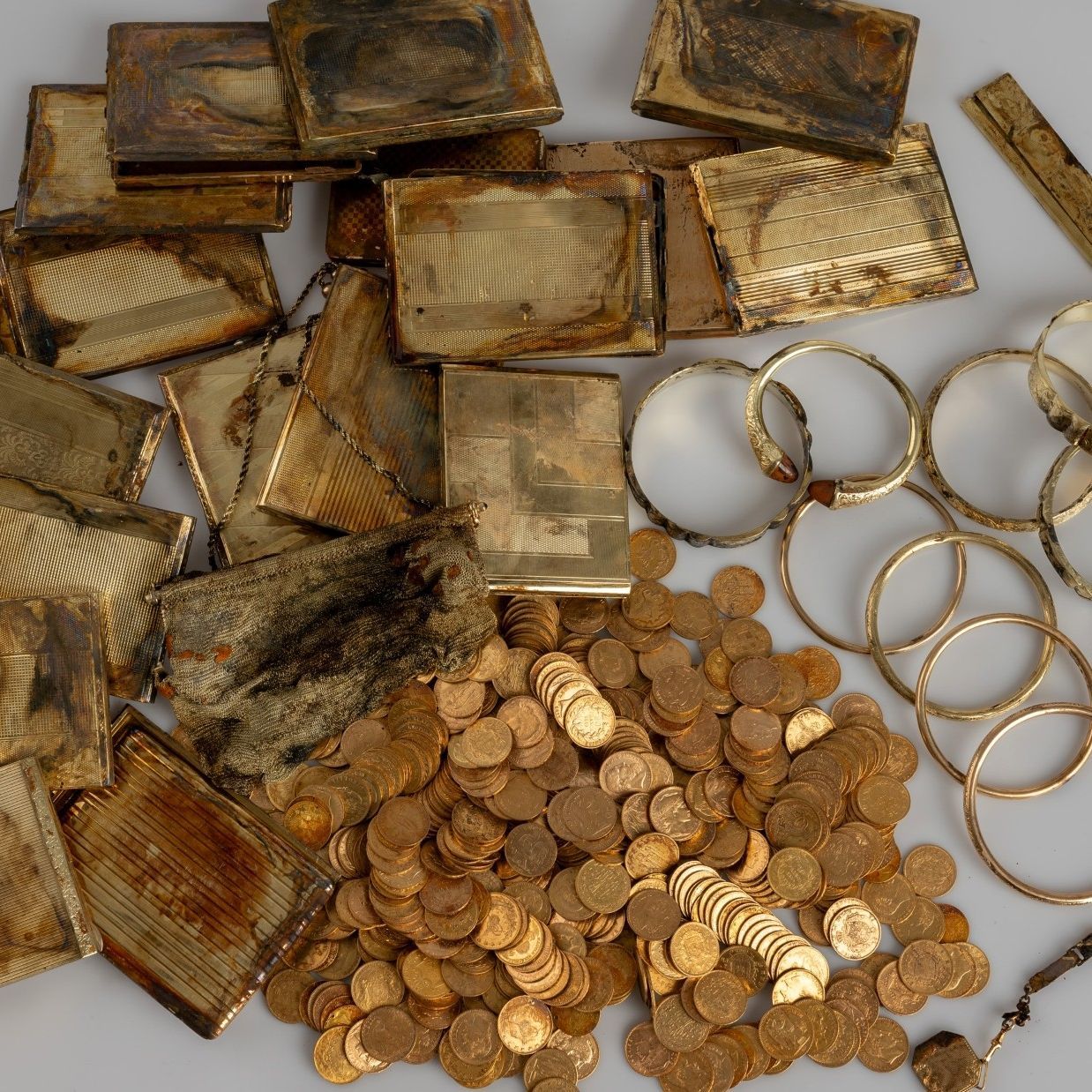Yürüyüş yapan iki kişi kayalık bir yamaçta alüminyum kutu içinde altın bilezikler, puro kutuları, makyaj aynaları ve yüzlerce eski madeni para ile karşılaştı.